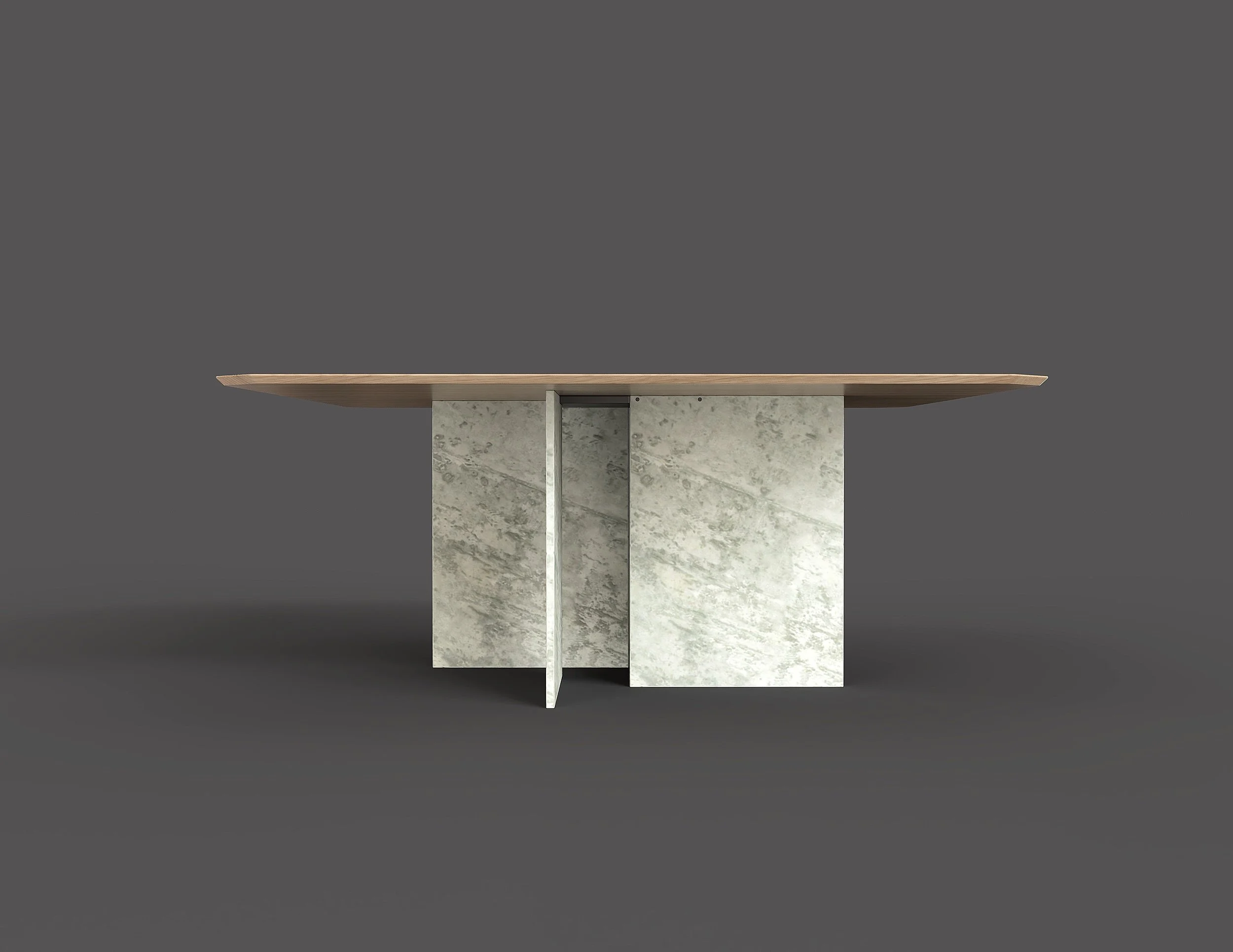 This dining table is conceived as a balanced dialogue between mass and lightness, combining monolithic stone planes with a refined solid wood top. The design emphasizes structural clarity, material honesty, and precise detailing. The table base is composed of four vertical stone slabs arranged in a cruciform configuration, creating a sculptural presence while maintaining generous legroom on all sides. A concealed central steel connector unifies the stone elements, ensuring rigidity while preserving the visual purity of the design. The floating wooden top appears lightly suspended above the stone base, enhancing the contrast between weight and levity.